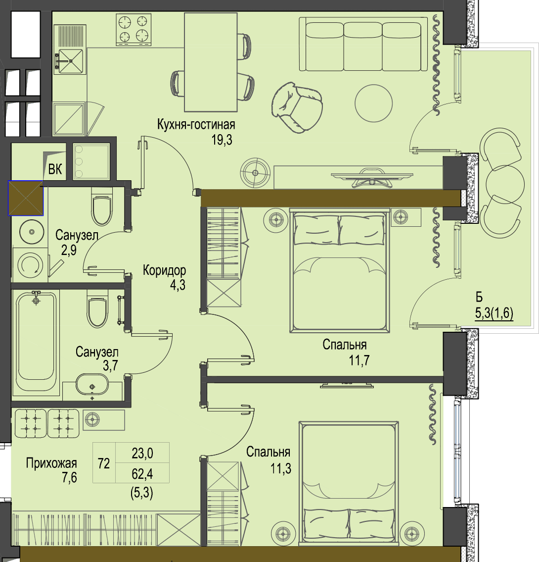 Загальна площа 62,4 м2 Житлова площа 23 м2 Кухня 19,3 м2 Лоджія 5,3 м2