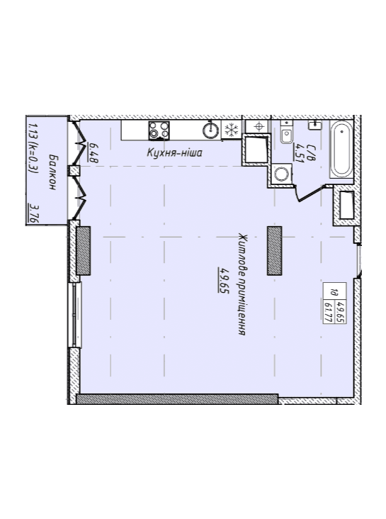 Загальна площа 58,9 м2 Житлова площа 18,5 м2 Кухня 22,5 м2