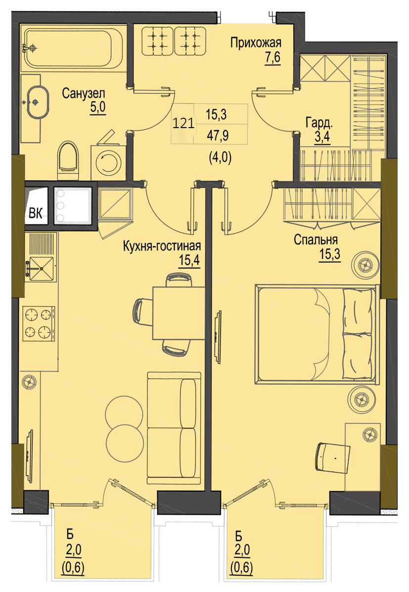 Загальна площа 47,9 м2 Житлова площа 15,3 м2 Кухня 15,4 м2 Лоджія 4 м2