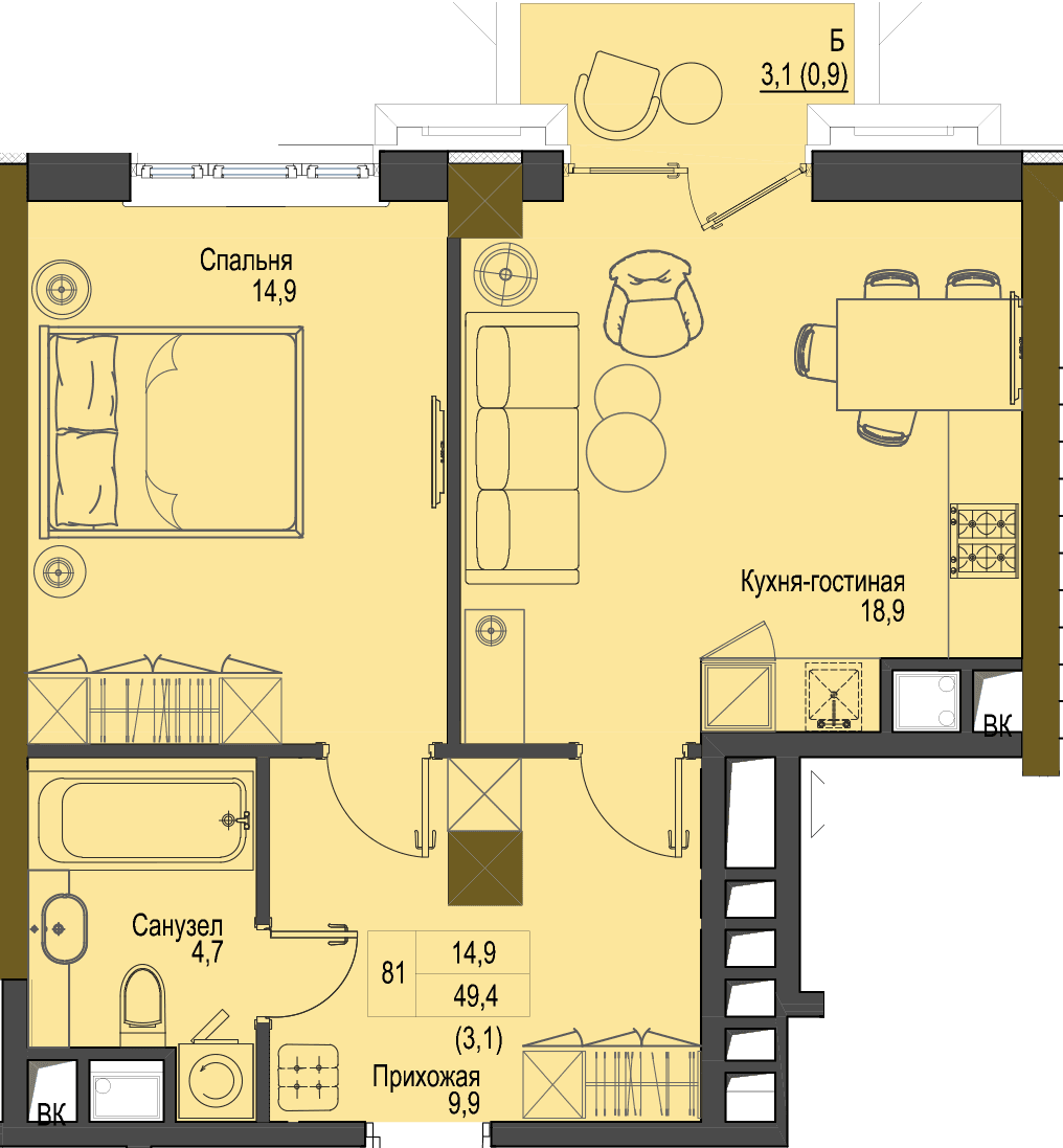 Загальна площа 49,4 м2 Житлова площа 14,9 м2 Кухня 18,9 м2 Лоджія 3,1 м2