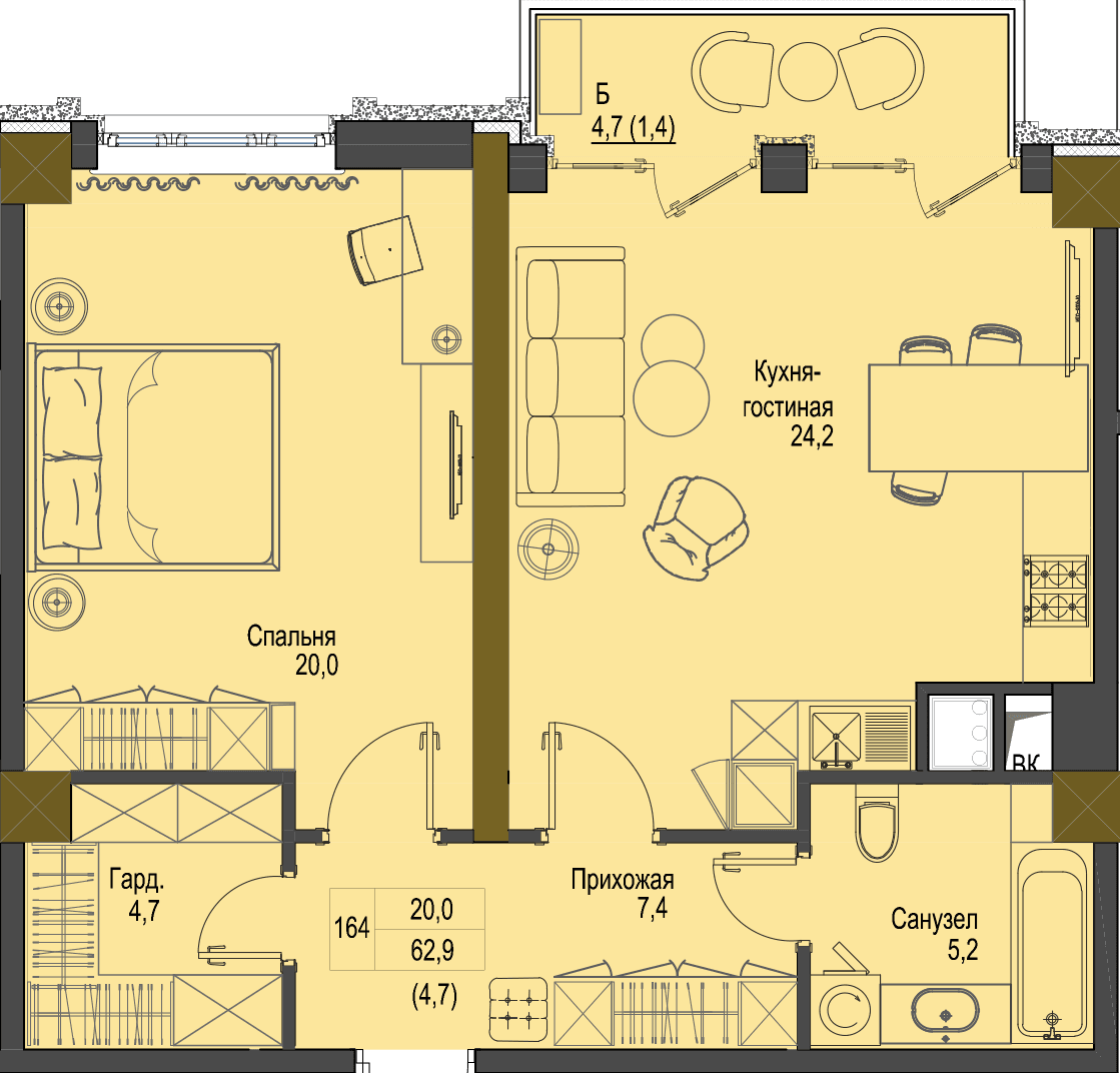 Загальна площа 62,9 м2 Житлова площа 20 м2 Кухня 24,2 м2 Лоджія 4,7 м2