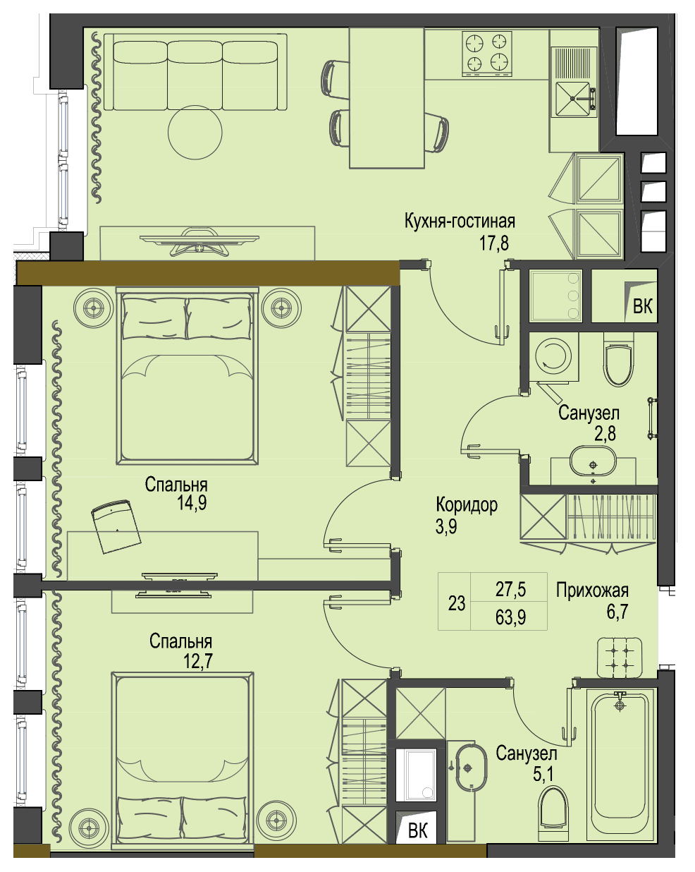 Загальна площа 63,9 м2 Житлова площа 27,5 м2 Кухня 17,8 м2