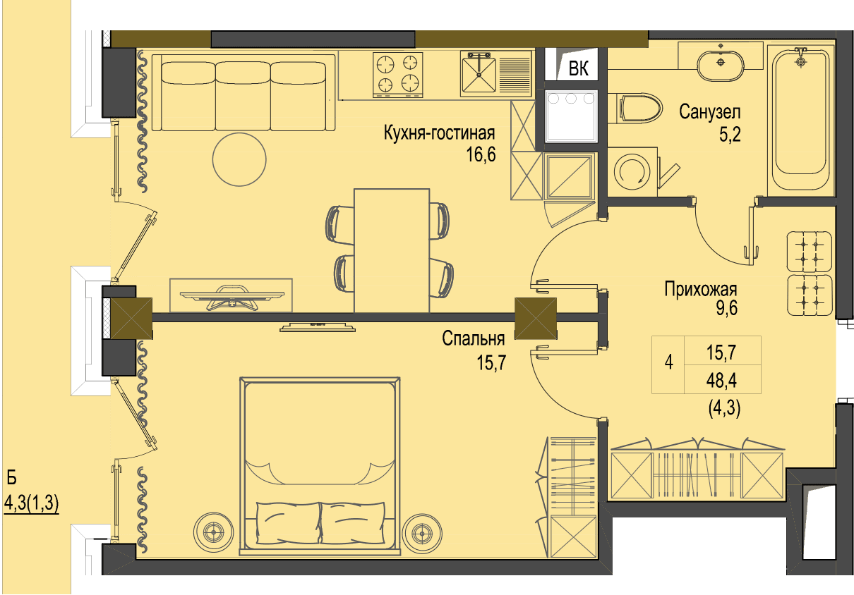 Загальна площа 48,4 м2 Житлова площа 15,7 м2 Кухня 16,6 м2 Лоджія 4,3 м2