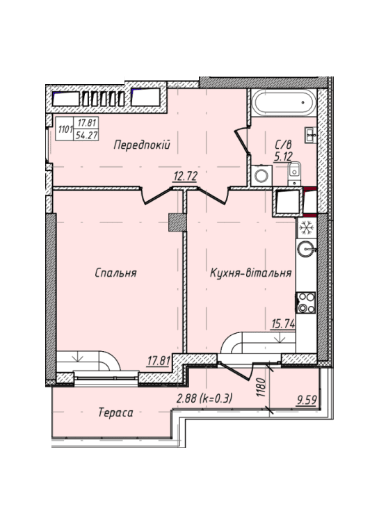 Загальна площа 54,6 м2 Житлова площа 18,3 м2 Кухня 17,3 м2 Лоджія 11,8 м2