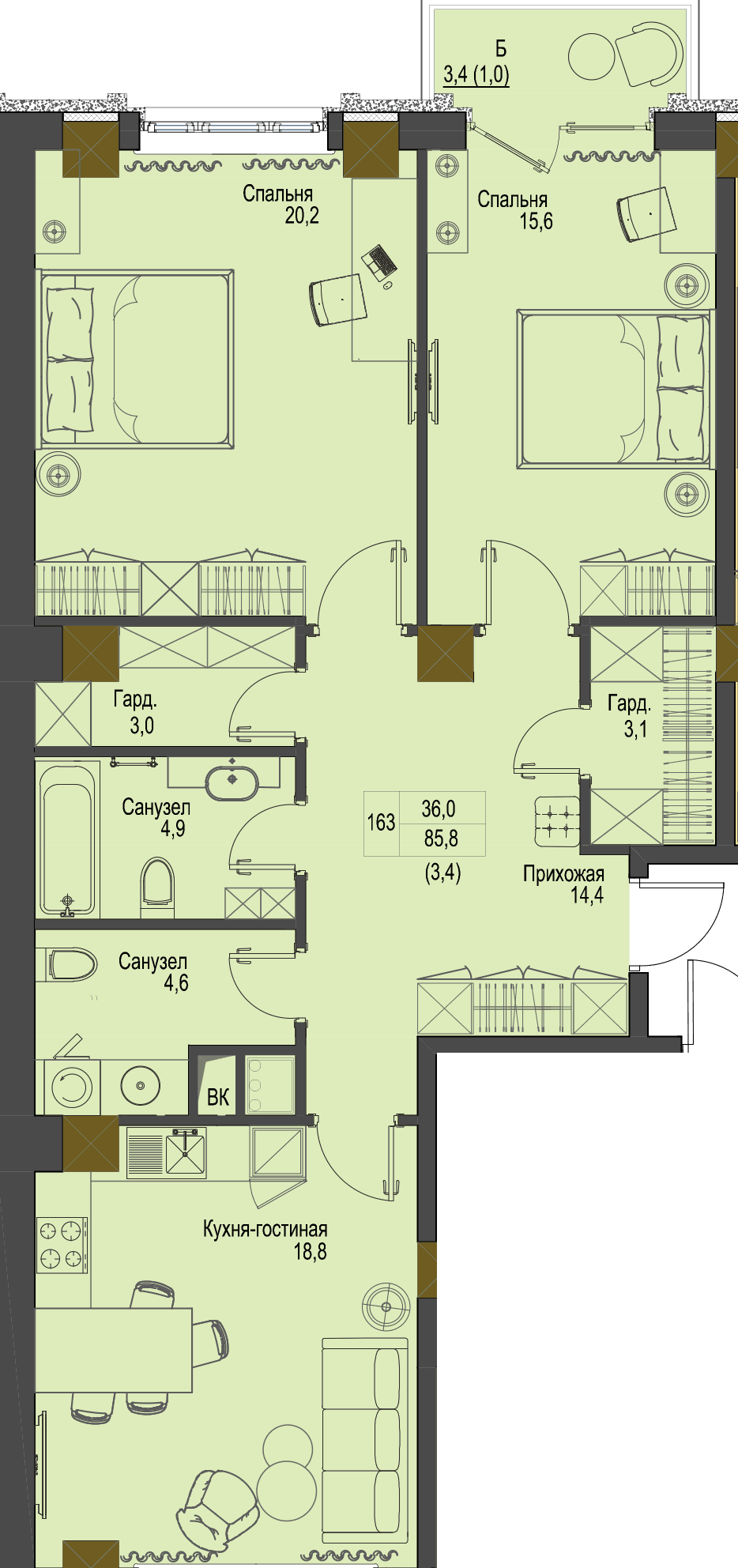 Загальна площа 85,8 м2 Житлова площа 36 м2 Кухня 18,8 м2 Лоджія 3,4 м2