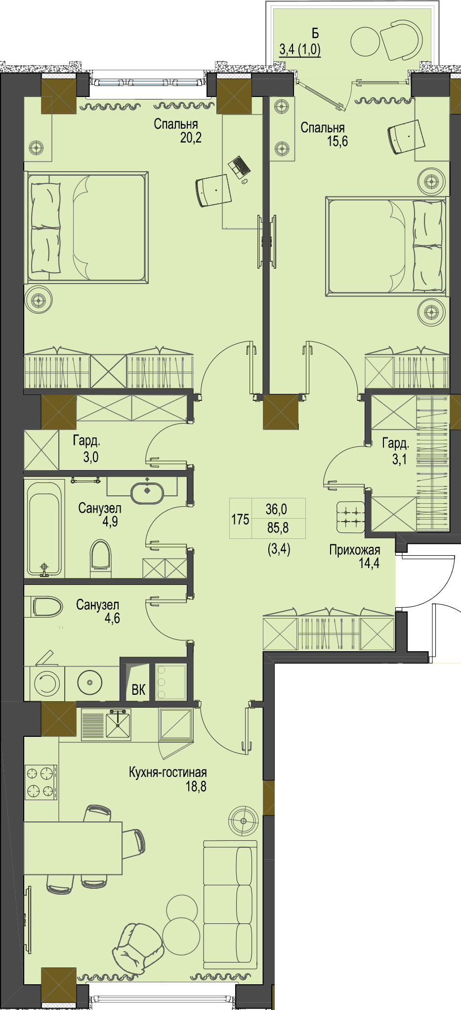 Загальна площа 85,8 м2 Житлова площа 36 м2 Кухня 18,8 м2 Лоджія 3,4 м2