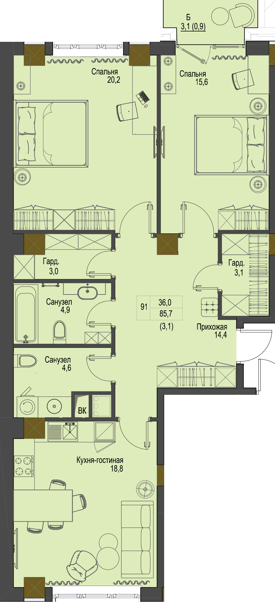 Загальна площа 85,7 м2 Житлова площа 36 м2 Кухня 18,8 м2 Лоджія 3,1 м2
