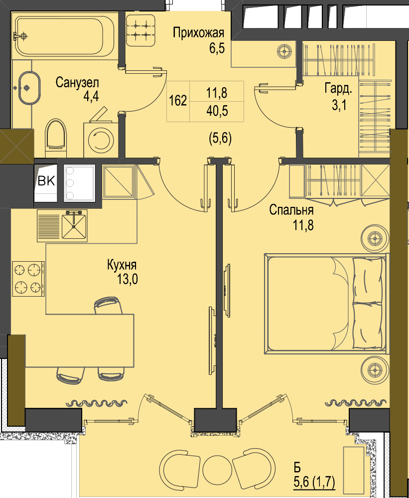 Загальна площа 40,5 м2 Житлова площа 11,8 м2 Кухня 13 м2 Лоджія 5,6 м2
